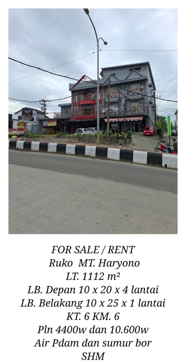 DIJUAL RUKO DI MT. HARYONO – HM – P Rp.18.000.000.000 08111755390 LB: 1000 m² LT: 1112 m² KT: 6 KM: 6 SHM Listrik: 4400 & 10600 Air: PDAM , Sumur Bor Share on Facebook Tweet Pin it WhatsApp Email